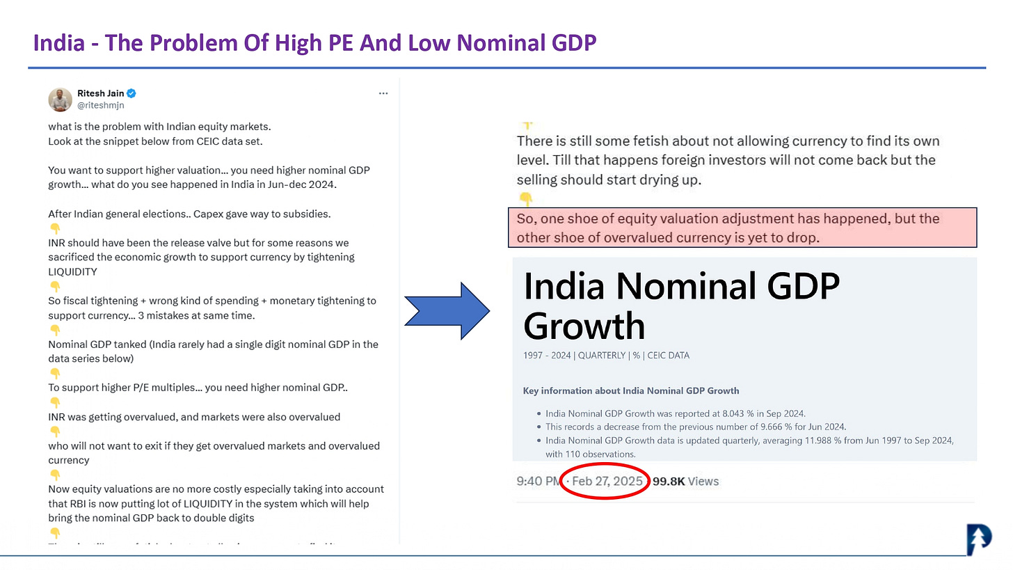 India faced stretched valuations, weak nominal GDP, and an overvalued currency over the past year. Valuations and currency have corrected, but nominal GDP growth remains a concern.