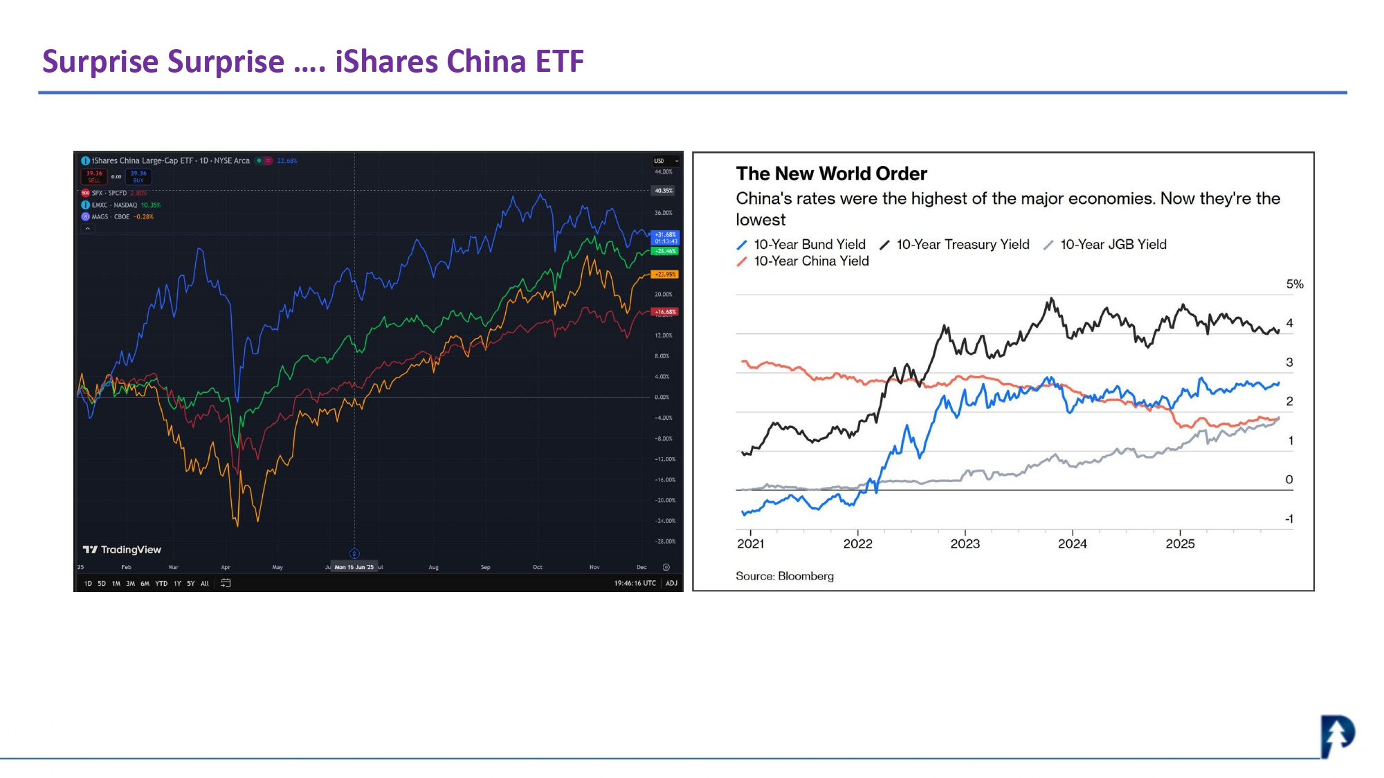 Chinese Equities and Chinese bonds are quietly winning, Chines bonds aided by sub-2% yields that support cheap capital. In contrast, US yields near 4% constrain re-industrialization.