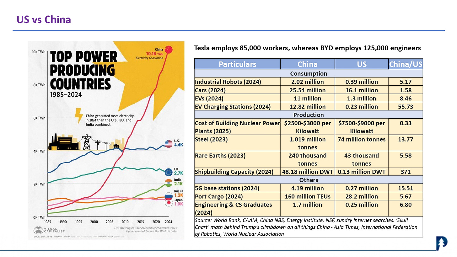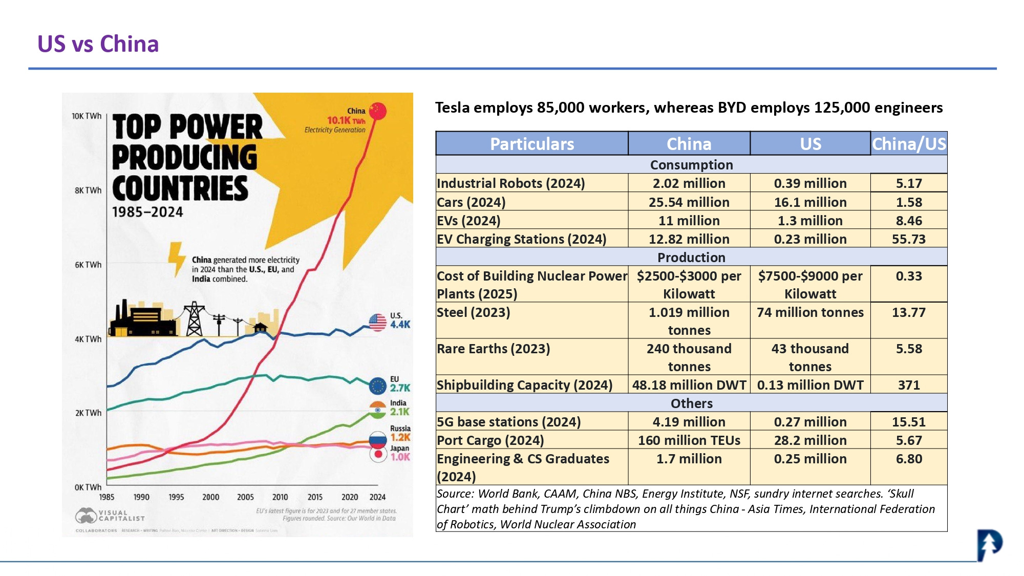 The rivalry spans money, trade, production, and technology. It is an existential contest between the world’s top two powers. China leads on key production metrics, while the US remains consumption-driven and propped up by AI spending. Without AI, the US economy would likely slip into recession and rising power and infrastructure constraint is emerging as key bottleneck in AI and Data Center growth.