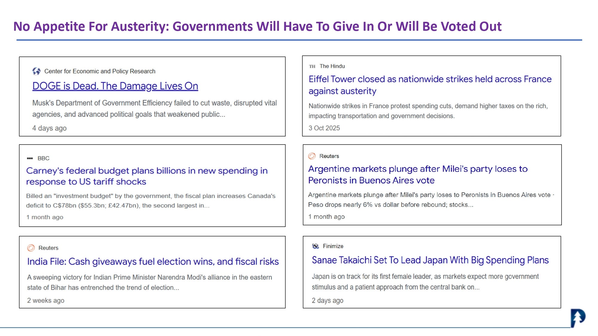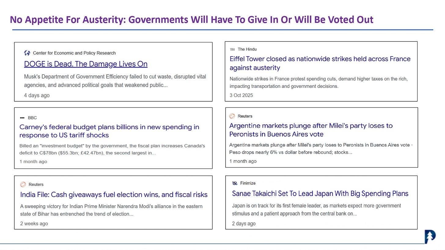 Austerity via spending cuts and higher taxes is politically unviable in democracies and consistently rejected by voters. Re-industrialization is the more likely path, even though it entails higher inflation and financial repression that erodes savings.