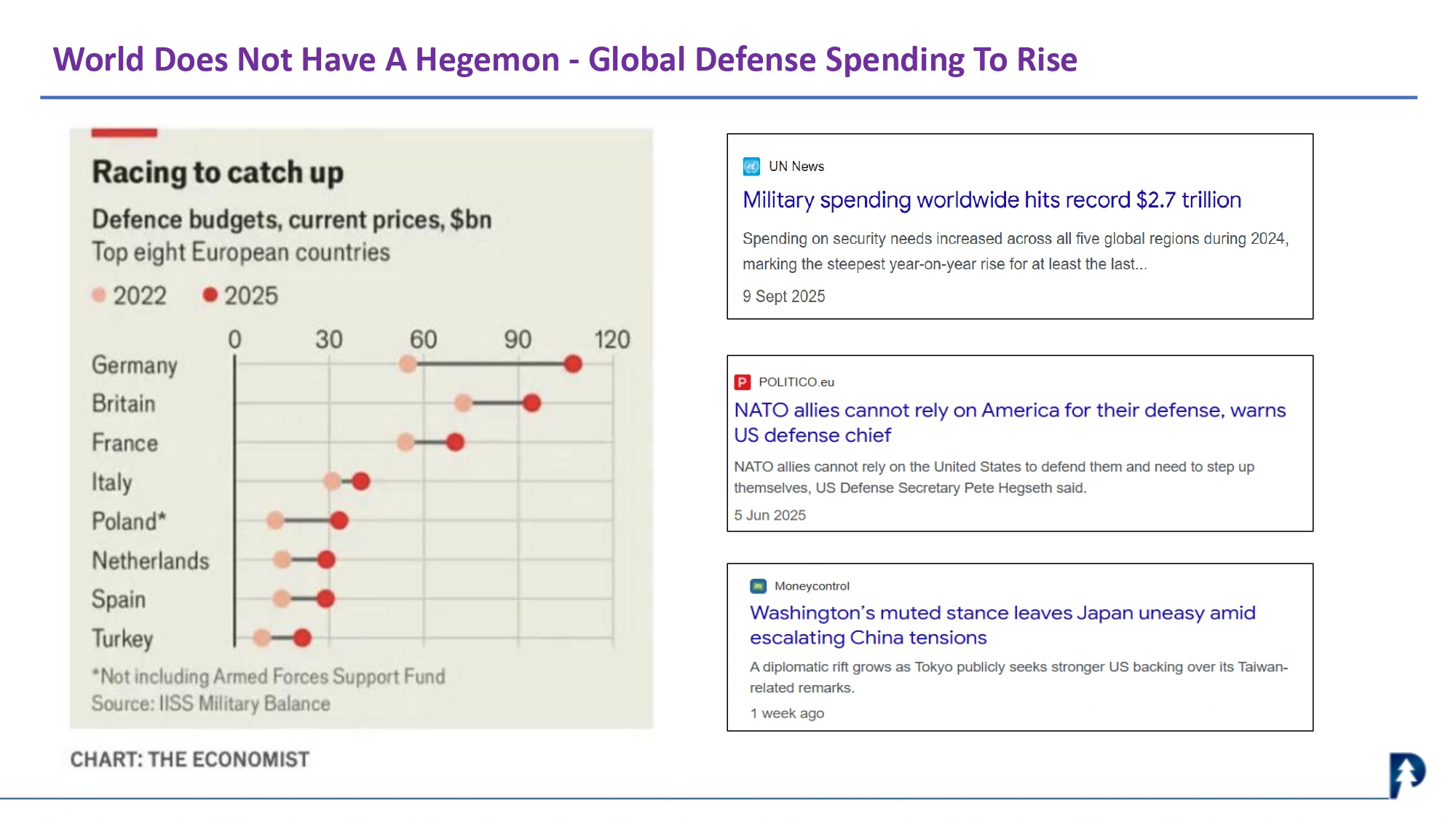 The US is no longer willing to police the world or fully underwrite the reserve-currency system. Its military umbrella is receding, forcing other nations to prioritize self-reliance and security. As the global hegemon steps back, countries rush to fill the vacuum. This inevitably leads to higher defense spending worldwide, despite economic and physical constraints.