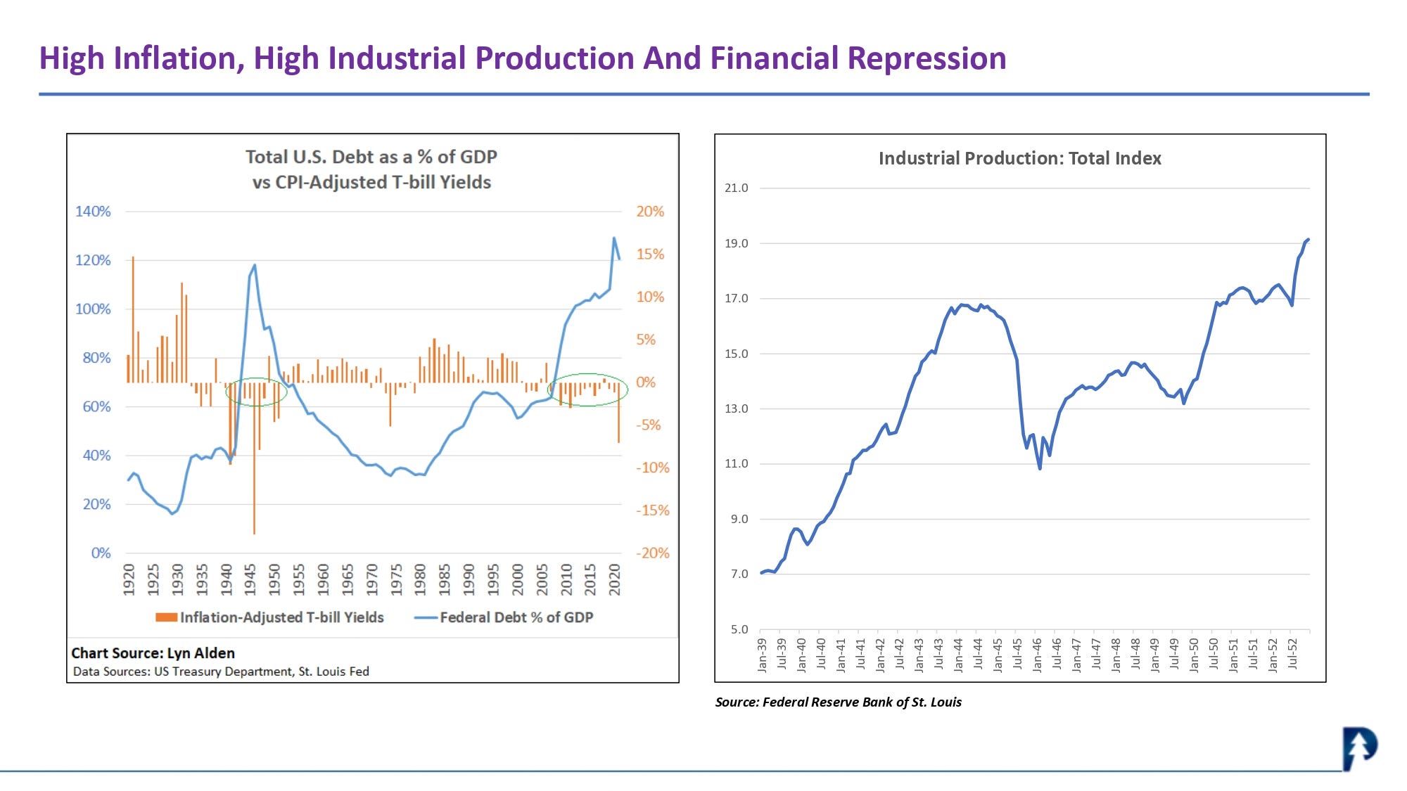 Post-WWII, the US effectively inflated away its debt while simultaneously expanding industrial output. The most powerful tools at its disposal were sustained negative real interest rates and policy-driven economic growth.