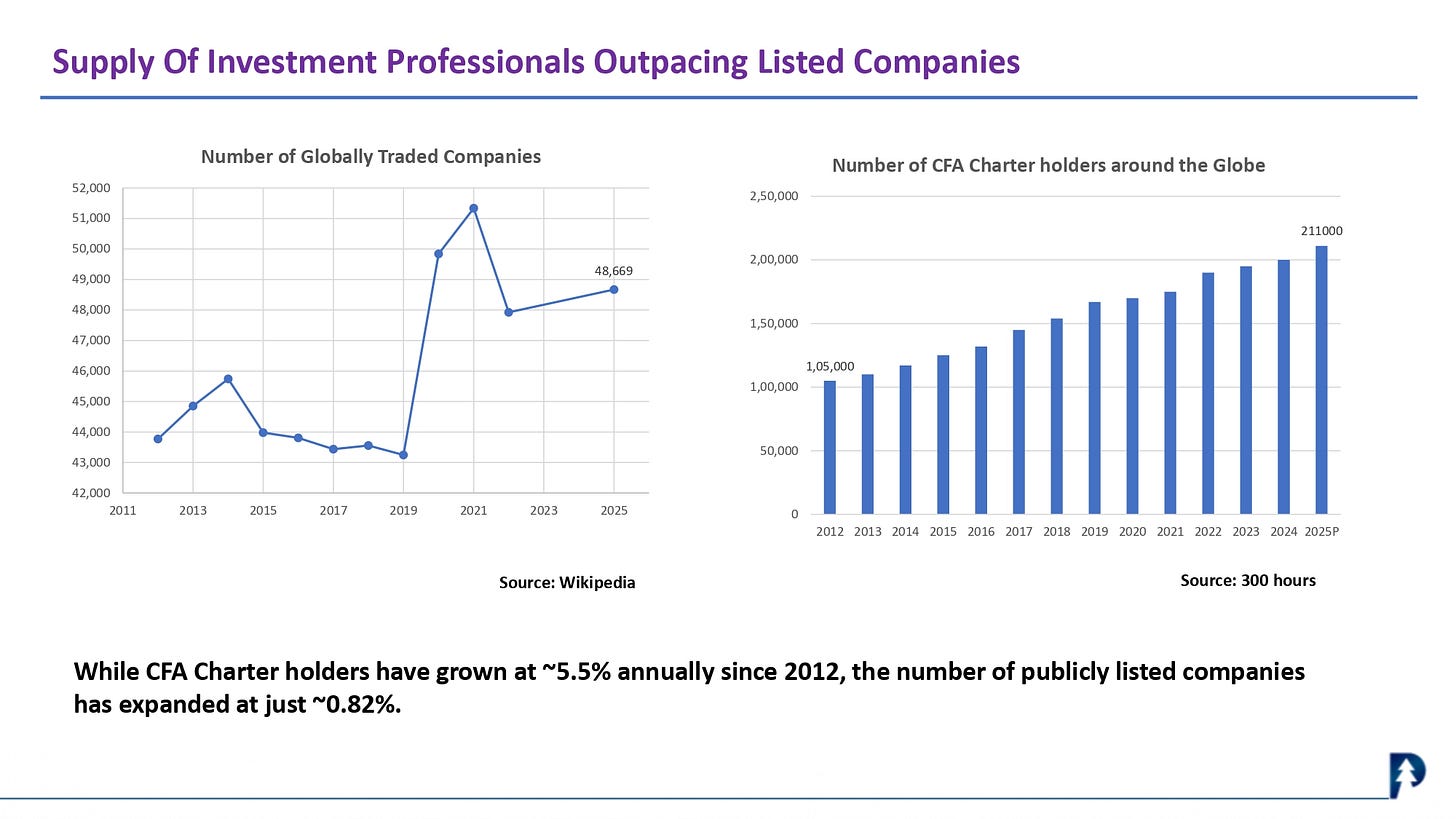 The supply of investment professionals led by rapid growth in CFA charter holders, is rising far faster than the universe of listed companies, intensifying competition.