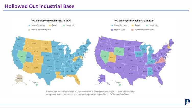 In 1990, manufacturing was the top employer in most US states. Today it’s healthcare administration in 39 out of 51 states.
