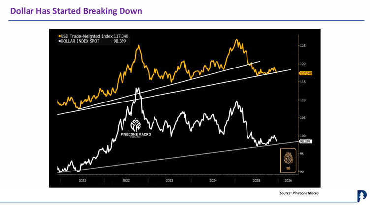 The USD trade-weighted index has broken its multi-year uptrend. This isn’t prediction, it’s already on the chart.