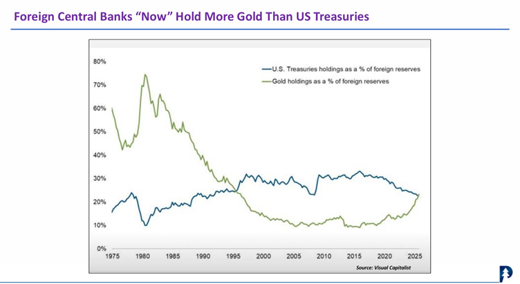 That crossover chart is the single most important investment signal of this decade. When central banks swap Treasuries for gold, they are voting with real money on where the monetary system is heading.