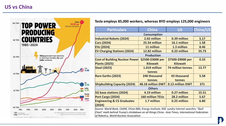 China generates more electricity than the US, EU, and India combined. It builds nuclear plants at one-third the US cost. It has 371x the shipbuilding capacity. The idea that the US can re-industrialise quickly without a decade-long infrastructure build is a fantasy.