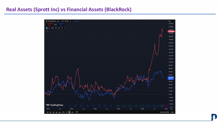 Sprott, the real assets manager is up nearly 200% over five years. BlackRock, the financial assets manager is up roughly 50%. The market is already telling you where capital is going.