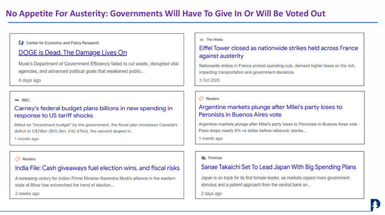 Our view: We’ve been making this point for two years. DOGE failed. France had nationwide strikes. Canada is expanding its deficit. India wins elections with cash giveaways. This isn’t a forecast anymore; it’s the news cycle.